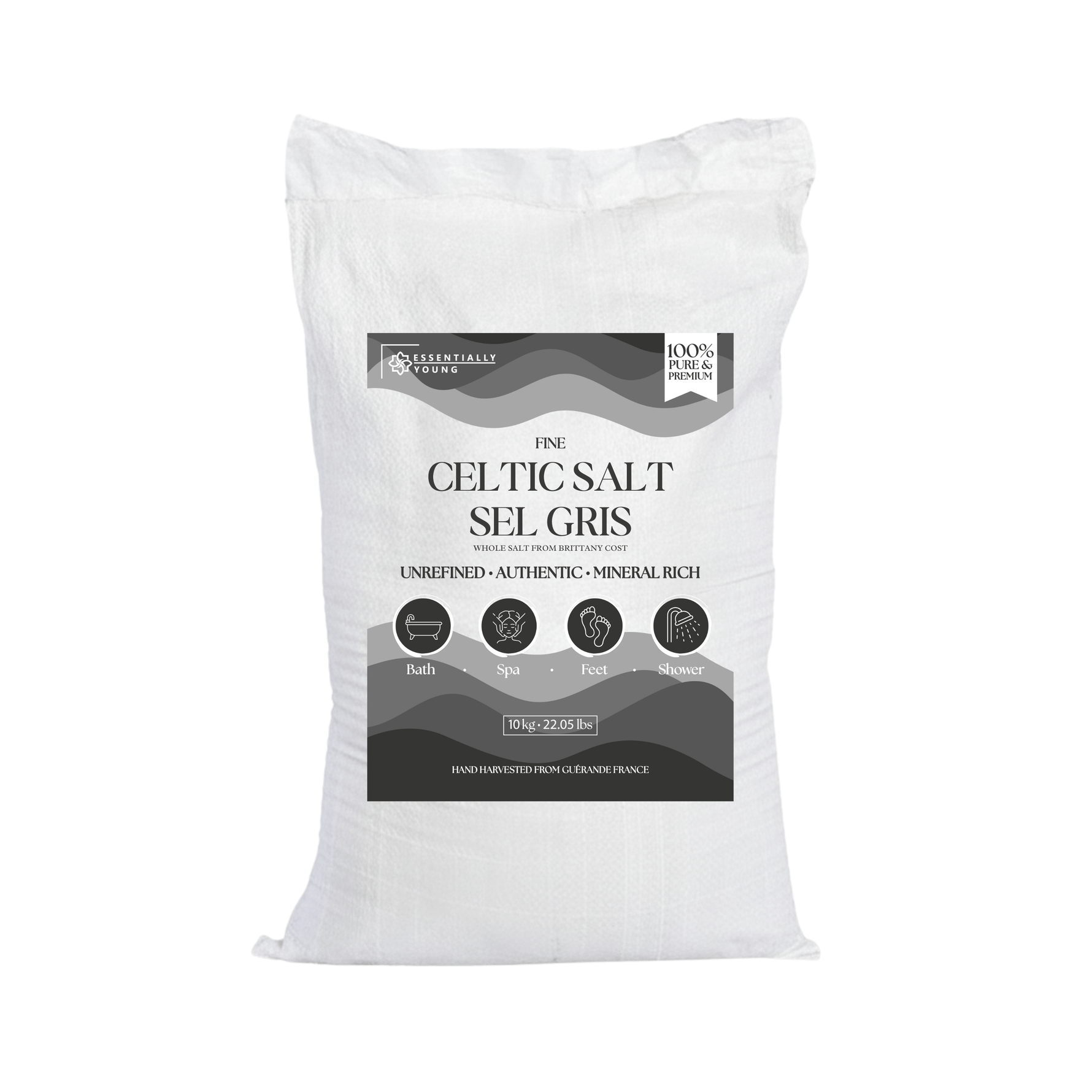Experience the natural purity of Essentially Young Fine Celtic Salt (Sel Gris, 10kg) — a premium, unrefined sea salt hand-harvested from the pristine coastal salt flats of Guérande, France. Naturally sun-dried and mineral-rich, this authentic French grey salt retains its essential trace minerals like magnesium, calcium, and potassium, offering both nutritional and therapeutic benefits. Its fine texture makes it perfect for culinary use, spa treatments, and natural skin care rituals.